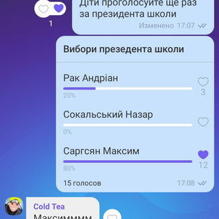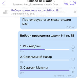 Згідно Положення про вибори лідера учнівського самоврядування в школі І-ІІ ступенів №18 Оболонського району міста Києва 30.09.2020 року в онлайн-формі пройшли вибори президента школи. Кандидати у президенти школи представили свою виборчу кампанію. За результатами онлайн-голосування переміг учень 9 класу Саргсян Максим, друге місце посів учень 7 класу Рак Андріан, третє місце отримав учень 7 класу Сокальський Назар. Вітаємо Максима з перемогою!